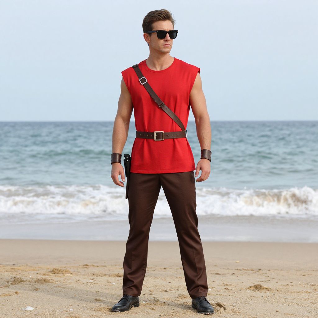 Photograph of a muscular man standing on a sandy beach with a blue ocean and white waves in the background. He has fair skin, short brown hair, and wears black sunglasses. He is dressed in a sleeveless, bright red shirt with a black diagonal strap across the chest, black brown pants, and black leather wristbands. A black belt with a silver buckle is fastened around his waist. He also wears black leather shoes. The sky is clear and blue, adding a bright, sunny atmosphere to the scene.