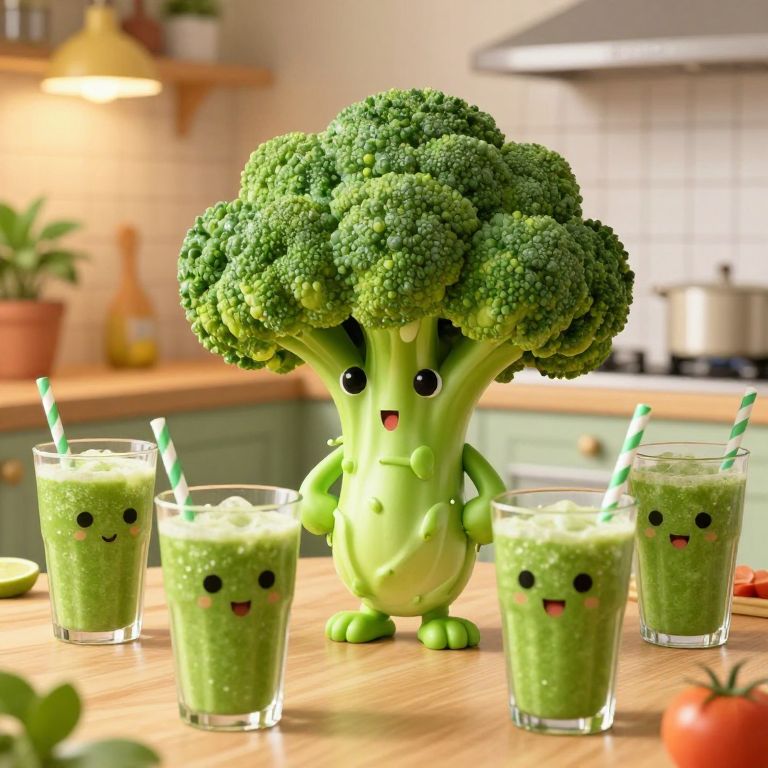 In a whimsical cartoon-style scene, a sentient broccoli character with a playful expression stands amidst an array of vibrant green smoothies adorned with cheerful faces, each served in clear glasses with striped straws, set against a cozy, retro-inspired kitchen backdrop featuring warm lighting and potted plants.