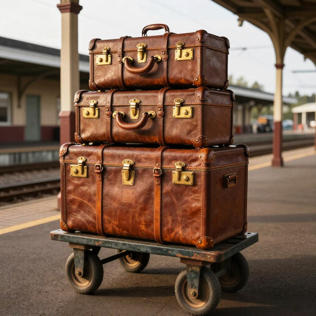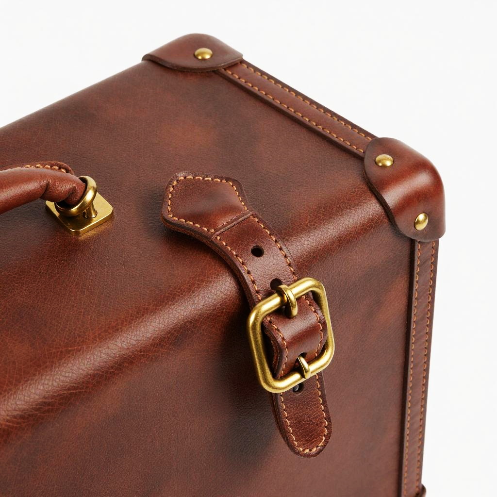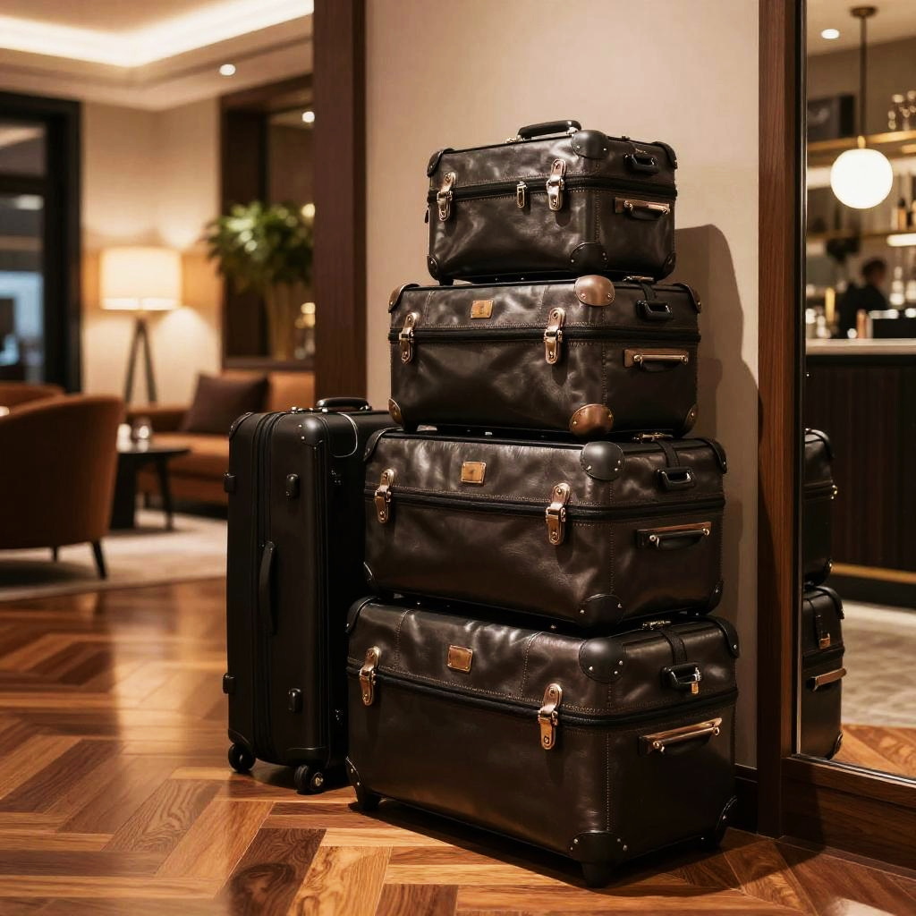 Barmes luggage stacked neatly inside a luxurious boutique hotel lobby, elegant polished wood floors, ambient warm lighting reflecting on fine leather surfaces, hand-crafted details, modern meets classic design aesthetics, mid-shot composition.