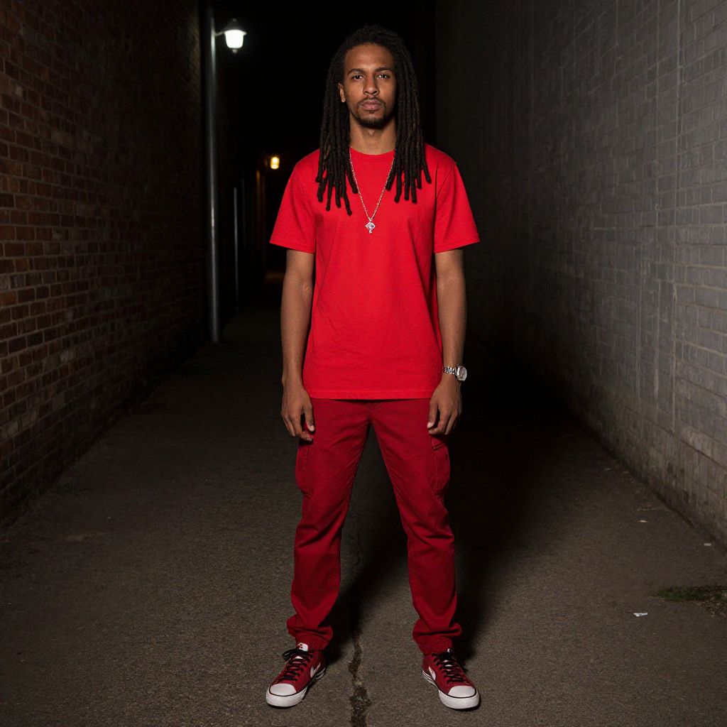 "Saturday Night Outfit, man with dreadlocks and red shirt standing in a dark alley"