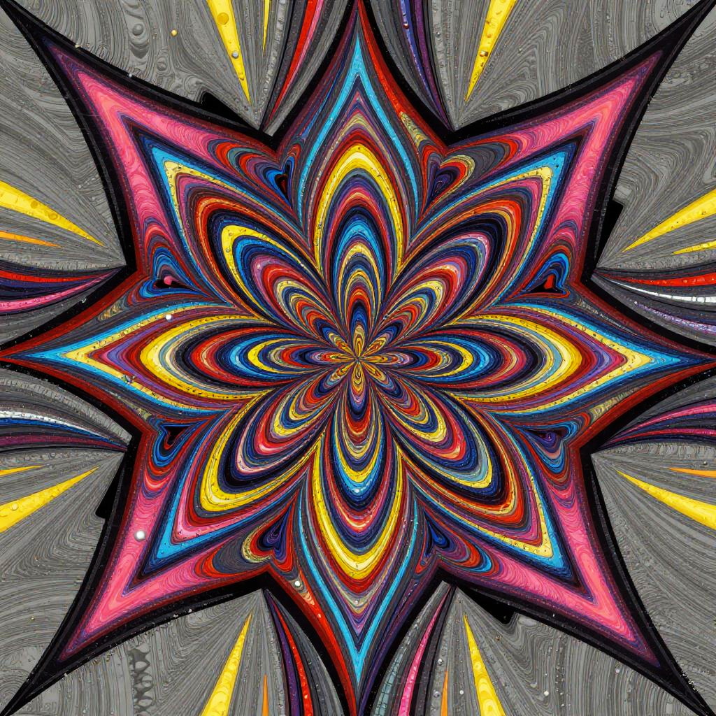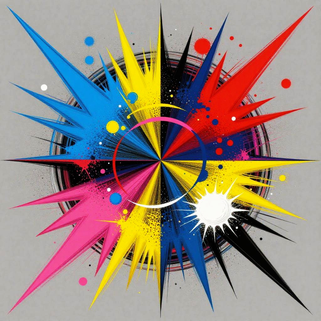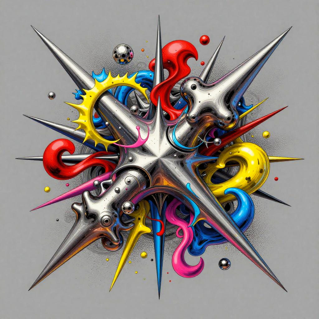 Metallic wildly imaginative, abstract illustration that fuses op art with comic book aesthetics. Kaleidoscope of colors including grey, red, blue, yellow, and pink with optical illusions. Bursting with energy.