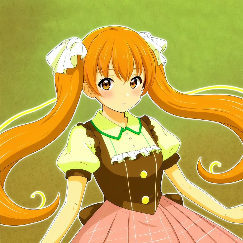 Digital anime-style illustration of Anjou Naruko from the series 'Ano Hi Mita Hana no Namae wo Bokutachi wa Mada Shiranai'. The character has long orange twin tails tied with white ribbons, brown eyes, and is dressed in a yellow blouse with a brown pinafore dress featuring large buttons and a pink skirt. The background is a textured green gradient.