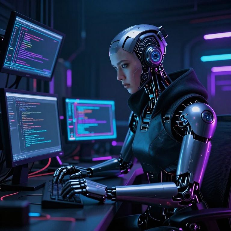 Janotor, a sleek and agile android hacker in a dark underground lair filled with holographic screens and neon circuits, coding rapidly, intense and focused expression, futuristic cyberpunk aesthetic with blue and purple lighting.