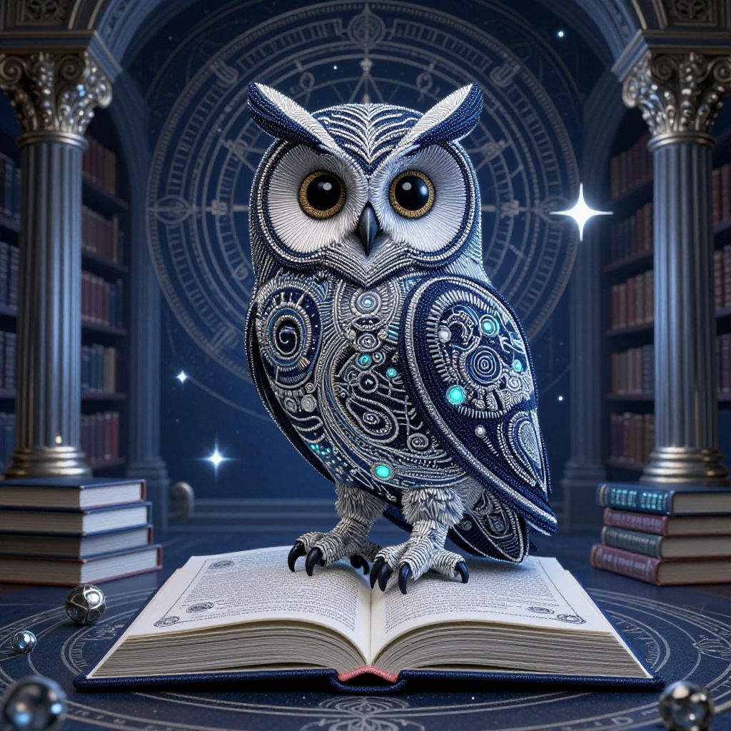 A digital illustration depicts a mystical library scene with a glowing, ornate wooden cabinet at its center. Atop the cabinet, a detailed, realistic owl with large, expressive eyes and intricate feather patterns perches. The cabinet emits a warm, golden light, illuminating a crescent moon-shaped, ethereal glow that floats in front of it. Surrounding the cabinet are shelves filled with old, leather-bound books, some of which are floating in mid-air, with pages fluttering. The background is dimly lit, adding a sense of mystery and magic to the scene. The overall color palette is rich with warm browns and golds, enhancing the magical, enchanted atmosphere.