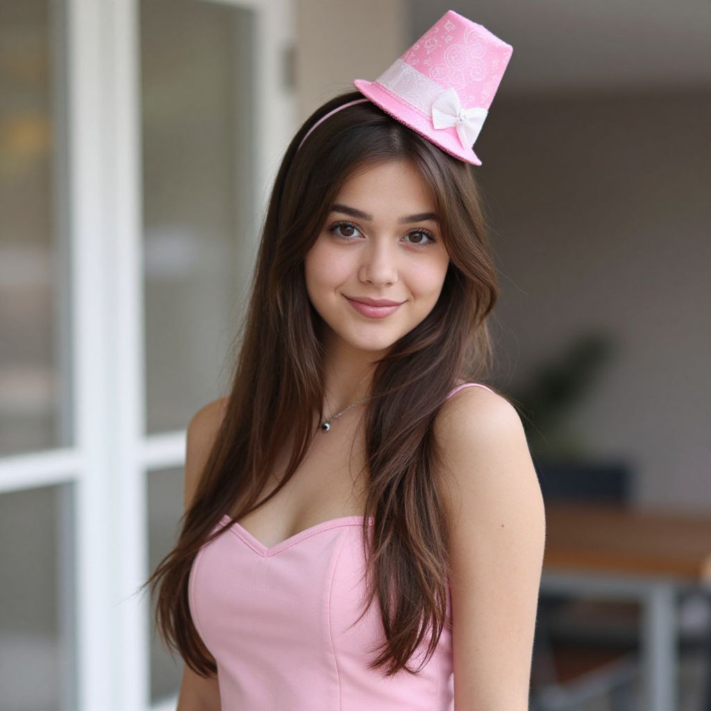 "euphoria cassie halloween, 1girl, solo, hat, long hair, brown hair, blurry background, looking at viewer, realistic, blurry, mini hat, dress, upper body, smile, brown eyes, pink dress, window, pink headwear Realistic photo of casual sexy person with pretty face"