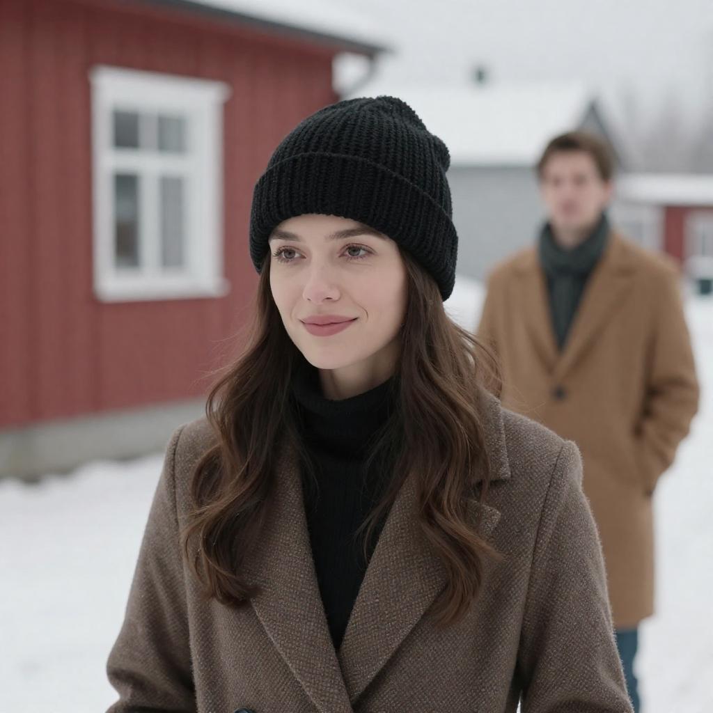Photograph of a smiling teenage girl with light skin and brown hair, wearing a white knit hat, red coat with a fur-trimmed hood, gray gloves, and blue jeans. She holds a glass mug in both hands. In the background, a person in a red Santa hat stands slightly out of focus. Snow-covered ground and a wooden structure are visible. Another person in a dark shirt is partially visible. The girl's expression is joyful, and she is slightly turned to the side.
