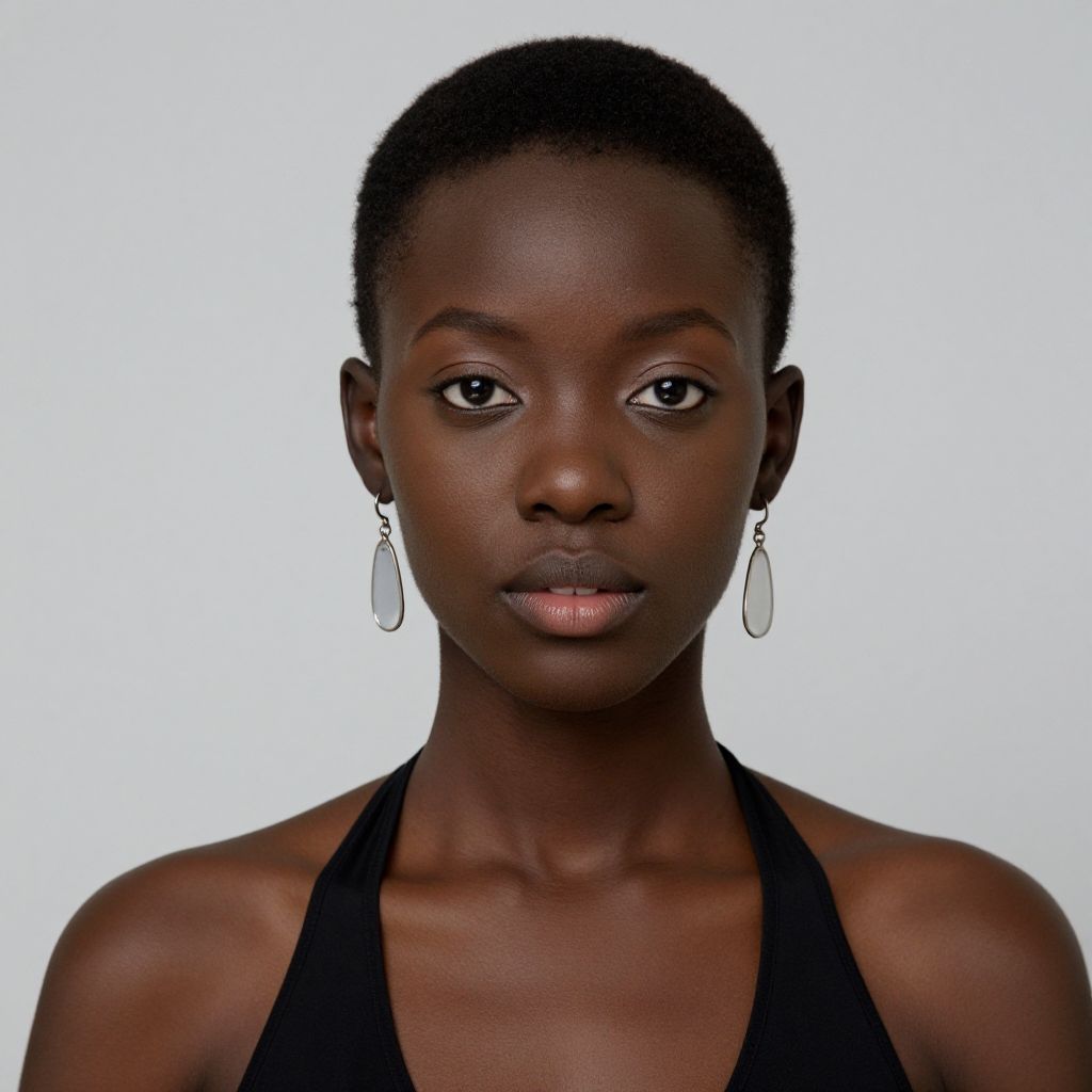 Short natural african, solo, earrings, jewelry, 1girl, black hair, looking at viewer, dark skin, realistic, portrait, short hair, halterneck, dark-skinned female, makeup