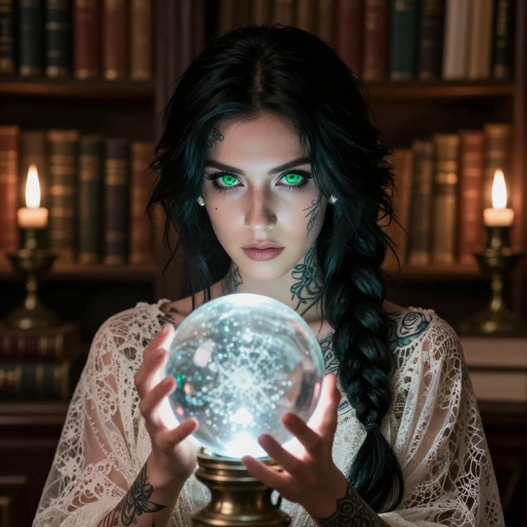 Imagine a portrait of an enigmatic fortune teller. Her piercing emerald eyes hold a mysterious, ethereal glow, matching the light emanating from the crystal ball in her hands. Intricate tattoos and flowing raven hair frame her intense, focused gaze as she peers into the future. The scene is set in an ancient library, dimly lit, with towering shelves of leather-bound books and flickering oil lamps adding to the atmosphere. The hyperrealistic details of the subject's smooth skin, delicate lace shawl, and carefully styled braided hair are accentuated, while the celestial light illuminates her face, creating an otherworldly aura.