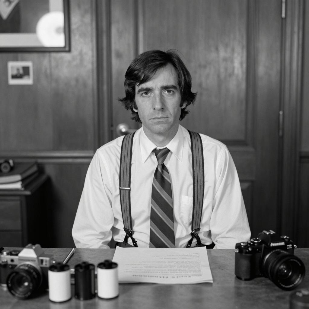 Black and white photograph of a young man with short, dark hair, wearing a light-colored shirt and dark tie, typing on an old-fashioned typewriter. He has a cigarette in his mouth, positioned to the left of the typewriter. Background includes a lamp, stacked papers, and a framed picture on the wall. The room has patterned curtains on the left. The typewriter has a visible ribbon and keys. The man's eyes are focused on the typewriter, and his expression is concentrated.