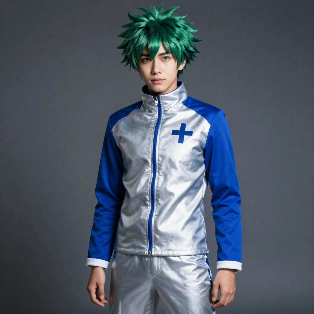 Photograph of a young Asian male with spiky green hair, standing against a dark gray background. He wears a shiny silver and blue athletic jacket with a blue cross on the left chest, and matching silver pants. The jacket has blue sleeves and white cuffs, and he has a neutral expression. The image has a slightly glossy texture, highlighting the reflective material of his clothes. The lighting is even, emphasizing the metallic sheen of his outfit.