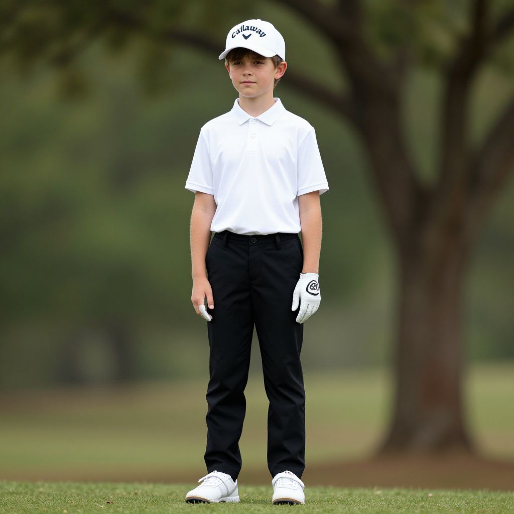 Photograph of a young boy golfer standing on a green, wearing a white shirt, black pants, white cap, gloves, and shoes. Bl