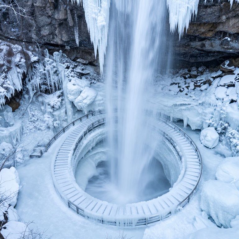 Photograph of a frozen waterfall with icicles hanging from a rocky cliff, cascading into a snow-covered circular pool surrounded by icy rocks.