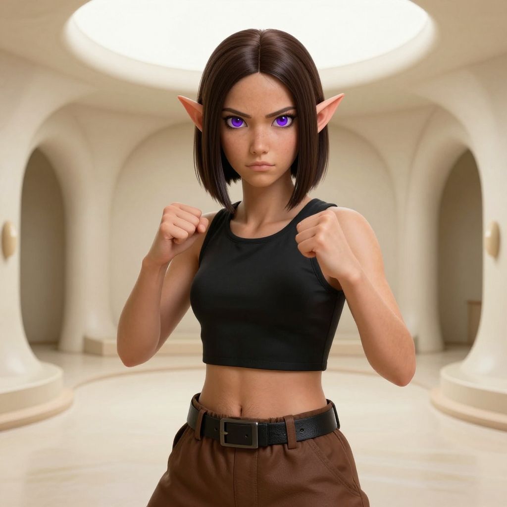 ASCIILapanya, 1 person, pointy ears, 3 fingers 1 thumb, ((snout nose)):1.2, flat chest, close-up, olive-tone skin, tall, square jaw, violet irises, dark brown hair, chin-length hair, straight bob haircut parted in the middle, athletic build, small nostrils, black sleeveless tunic, brown breeches, belt((sparring pose, fighting pose))Midriff, body hair, belly hair, armpit hair, ((happy trail))((indoors, vertical chamber, cavern, organic room, rounded floors, curved walls and doorways, ramps leading upward, polished floors and walls, smooth walls, clean walls, clean ceiling, cream colored)), clean lines, highly detailed, high quality, ((semi-realistic)), best quality, rating: g score_9, score_8_up