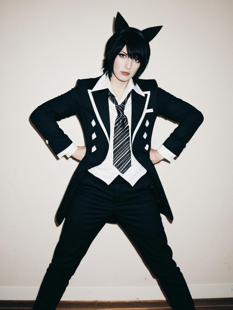 Portrait of a person wearing a femboy cosplay costume featuring black cat ears, a black blazer with silver trim, black tie, white shirt, black leather gloves, and black shorts. The subject has short black hair and a neutral expression, posing against a plain grey background.