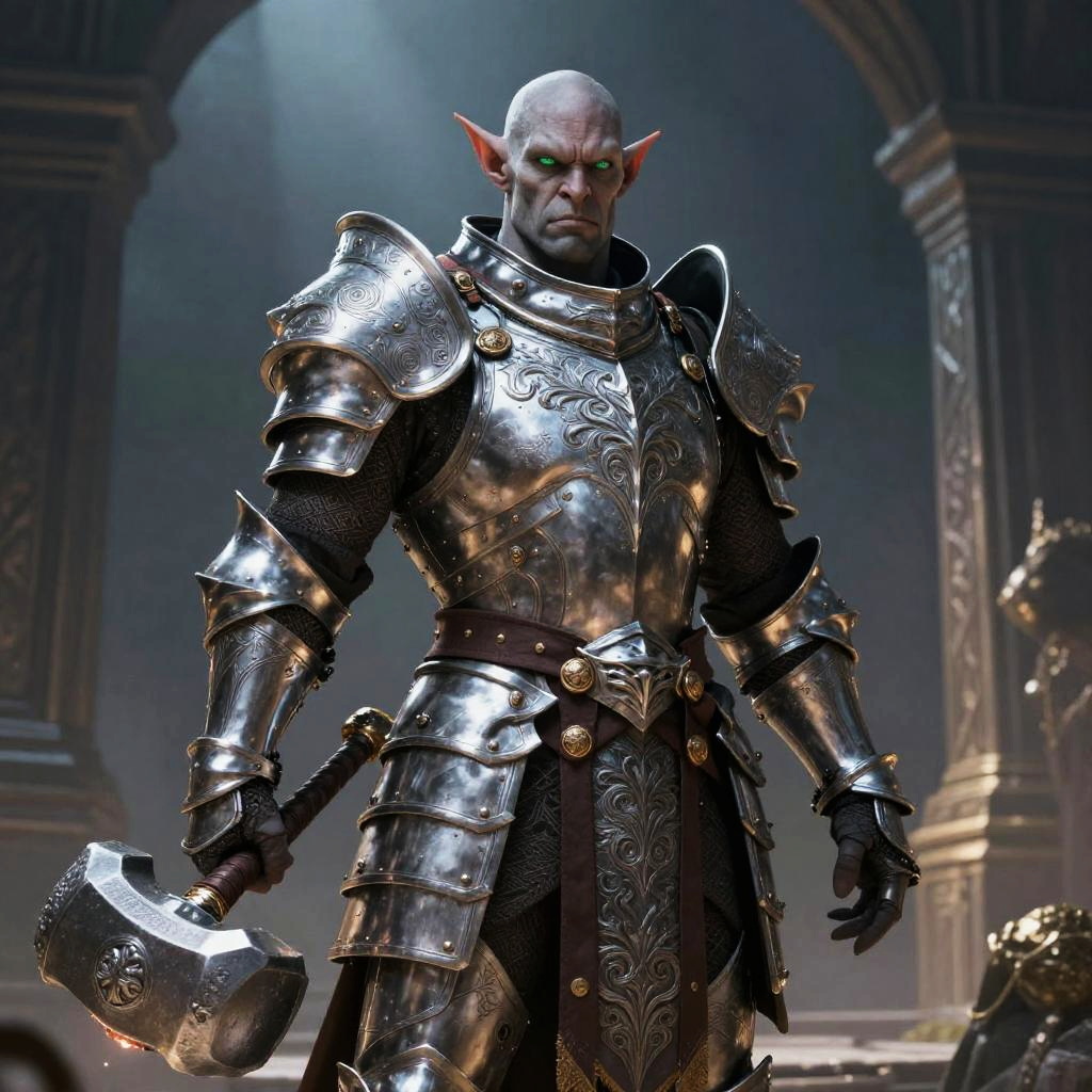 This is a CGI-rendered image of a muscular, bald, humanoid character with pointed ears, standing in an ornate, dimly lit ancient temple. He wears intricately detailed, shiny silver armor with elaborate patterns, and holds a large, matching silver war hammer in his right hand. His face is stern, with green eye shadow. The background features tall, arching columns with decorative carvings, casting shadows that enhance the temple's grandeur. The character's armor is adorned with gold accents, and a dark, patterned cloth belt is visible around his waist. The scene is illuminated by a soft, overhead light, highlighting the character's imposing figure.