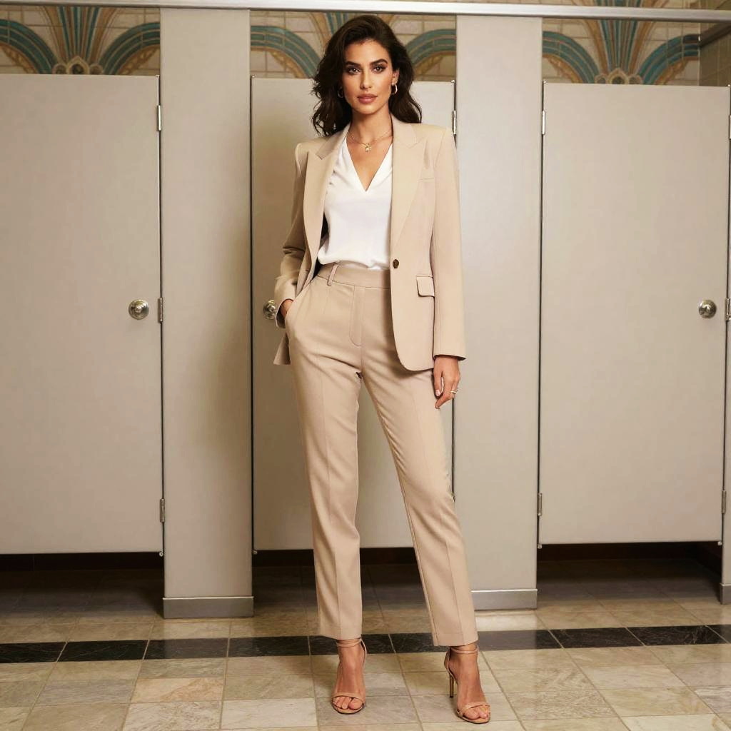 A woman in a tailored red jumpsuit with a pointed collar and cinched waist, paired with black strappy heels and minimalist silver stud earrings, stands confidently in an outdoor movie in a castle courtyard, embodying a modern visual style. Sexy. Pretty face and beutiful eyes