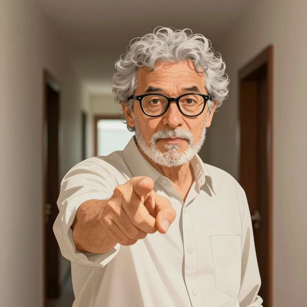 Illustration of an older man with grey curly hair, glasses, and a short beard, pointing directly at the viewer. He wears a light-colored shirt. His expression is intense. Background has a narrow, ured hallway with dark and light areas. He is in the center, foreground, and upper body, with his hand extending towards the viewer.