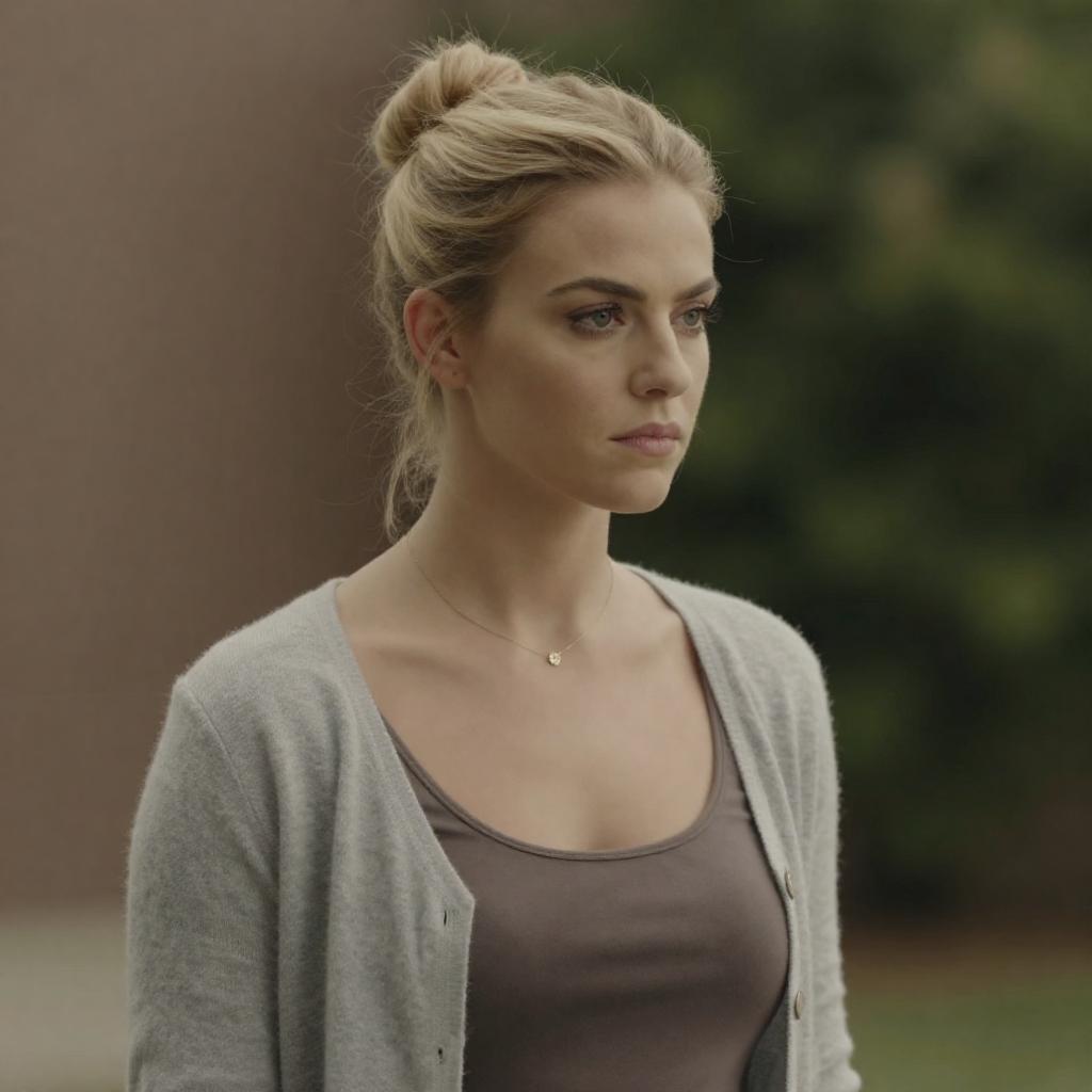 Photograph of a slender, blonde woman with her hair in a bun, wearing a gray cardigan over a brown top, and a delicate necklace. She is looking to the right with a serious expression. The background is blurred greenery and a brown wall. The image has a warm, slightly yellowish tone.