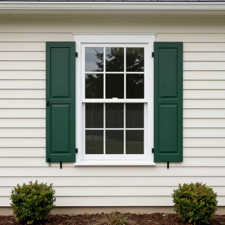 Window World showcases a classic double-hung window installation featuring a pristine white frame flanked by dark green shutters, set against a light beige vinyl siding exterior, complemented by two small shrubs and mulched ground below.