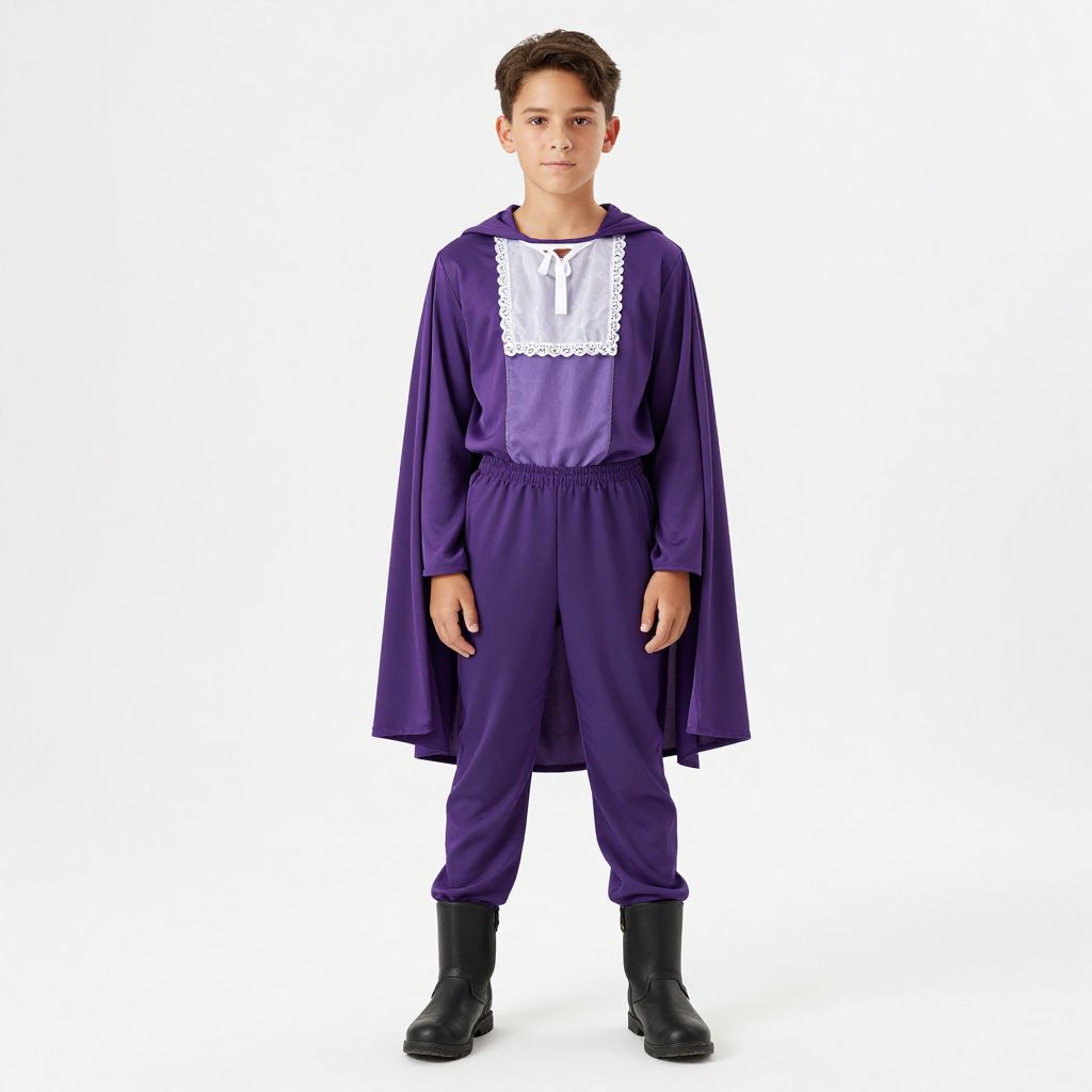 Photograph of a young boy with short brown hair, wearing a purple medieval-style tunic with white lace, long sleeves, and black boots, standing