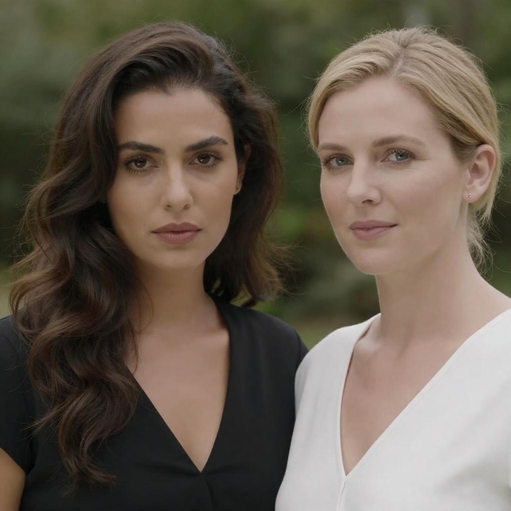 Photograph of two women standing side by side outdoors. The woman on the left has short brown hair, fair skin, and wears a blue sleeveless top, holding a glass. The woman on the right has long brown hair, tan skin, and wears a blue top with a floral necklace. Both have serious expressions, with sunlight filtering through leaves in the background.