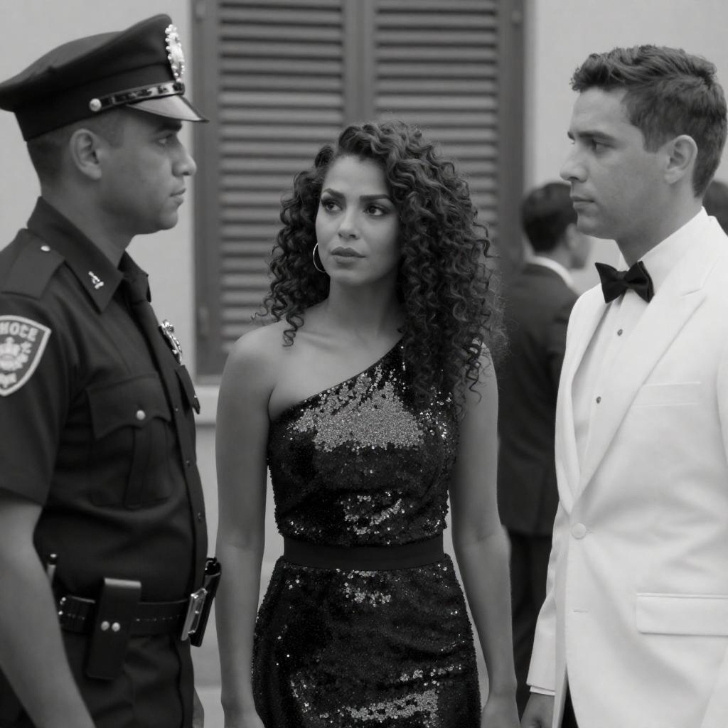 Photograph of four people. Woman in red, fringed, one-shoulder dress with short, dark curly hair, stands center. Man in dark military uniform with cap on left, holds papers. Older man in light blue suit with mustache stands right of woman. Tall man in white suit with yellow tie stands far right. Indoor setting with blurred background. Intense expressions on woman and man in white suit.