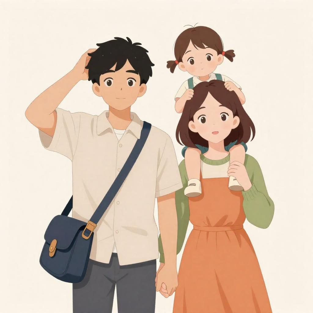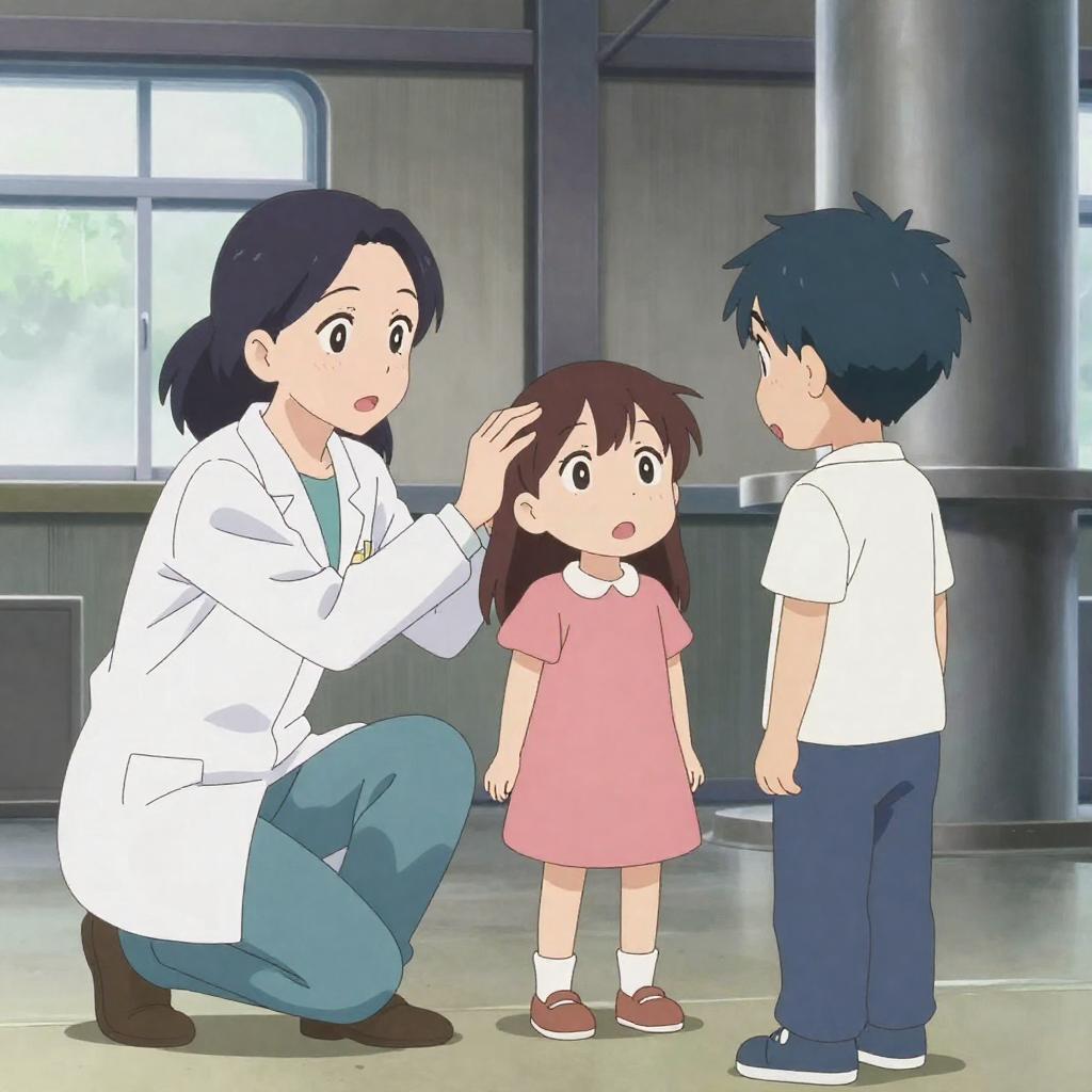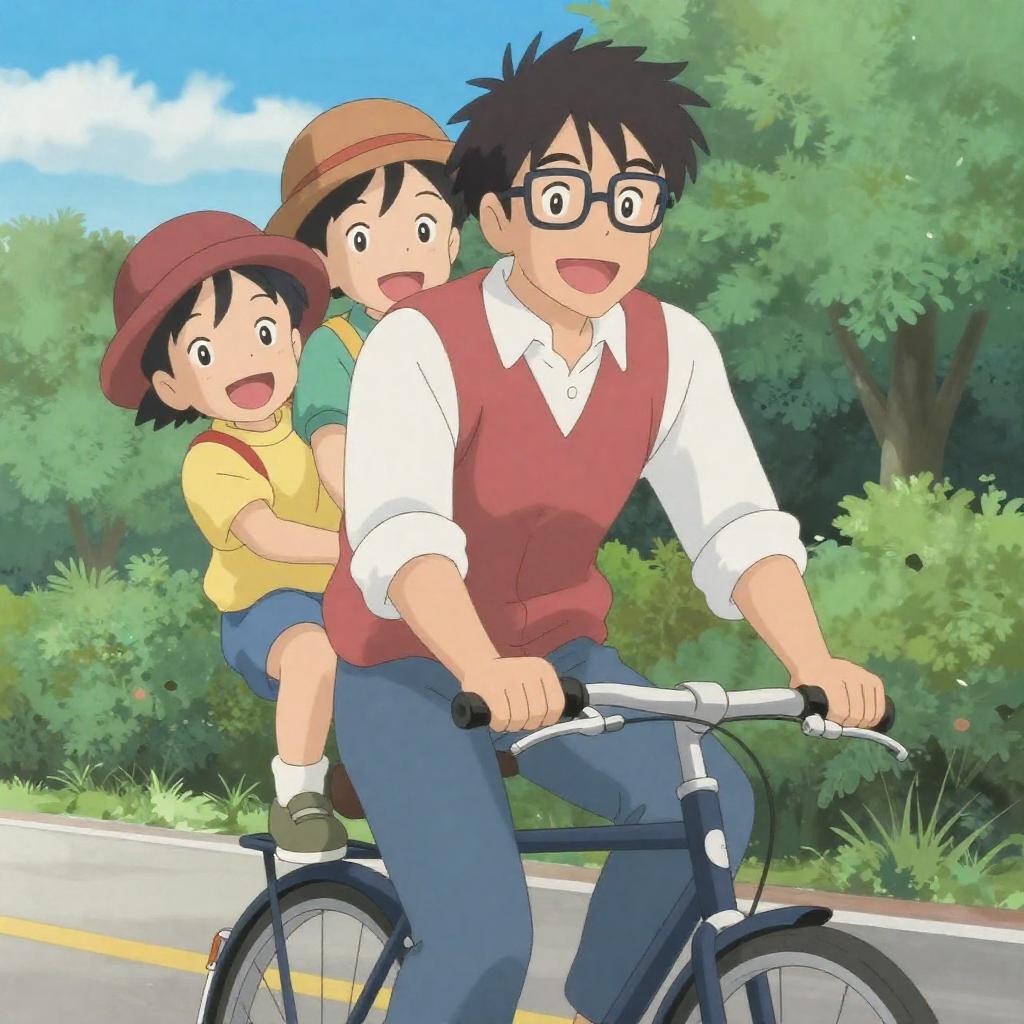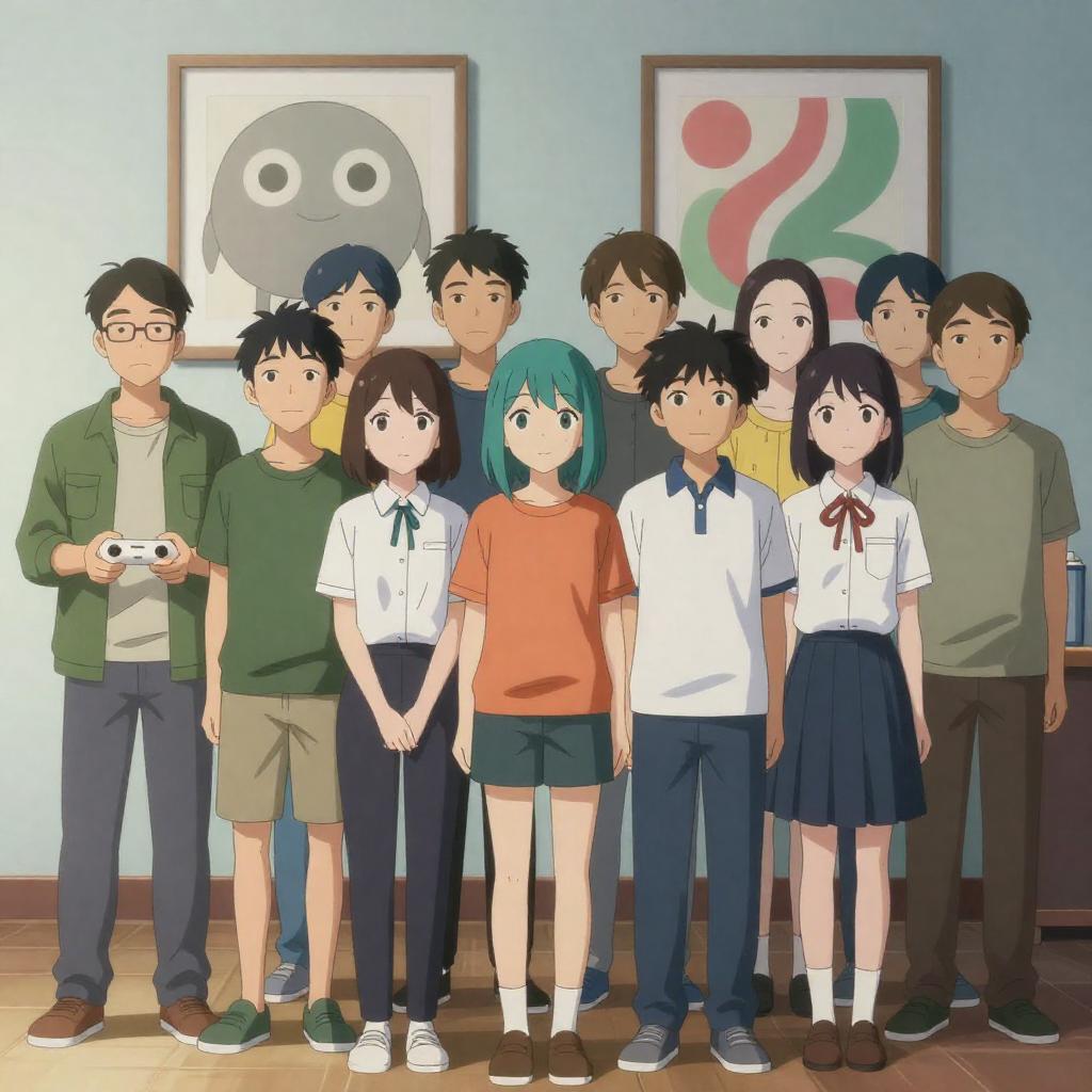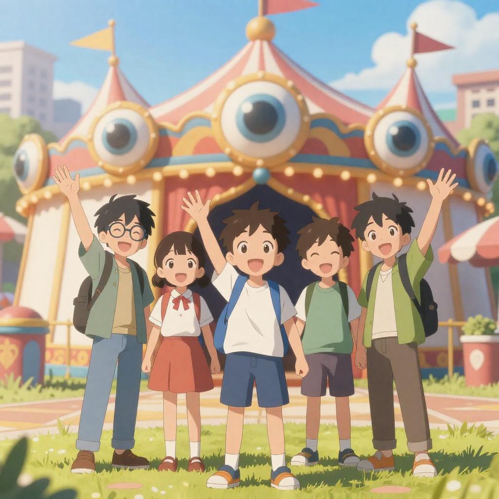 Anime-style illustration of five children in a colorful, carnival-like setting. They stand in front of a vibrant, ornate tent with large, eye-shaped decorations. The children are smiling and posing cheerfully, with two raising their hands. Background includes a cityscape and bright sky. One boy wears glasses, others wear casual clothes. Tent has intricate patterns and lights.
