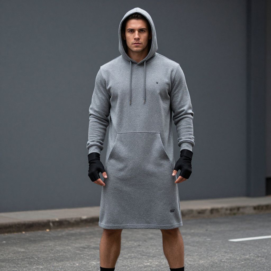 Photograph of a muscular, light-skinned man standing on an urban street. He wears a loose, grey hooded sweatshirt dress that reaches mid-thigh, with black fingerless gloves and a serious expression. The sweatshirt has a small logo on the left chest and a drawstring hood. His legs are bare, showing short hair. The background is a muted grey wall, and the street has a worn, asphalt texture with a white painted line in the lower right corner. The overall style is modern and streetwear-focused.