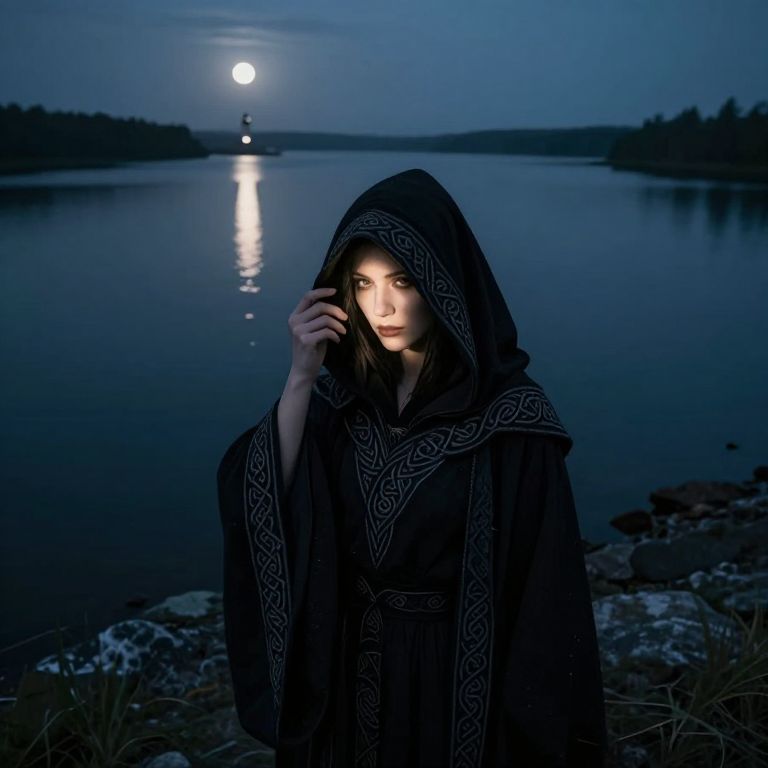 Photograph of a fair-skinned woman with pale blue eyes, wearing a dark hooded cloak with intricate patterns, standing by a moonlit lake,