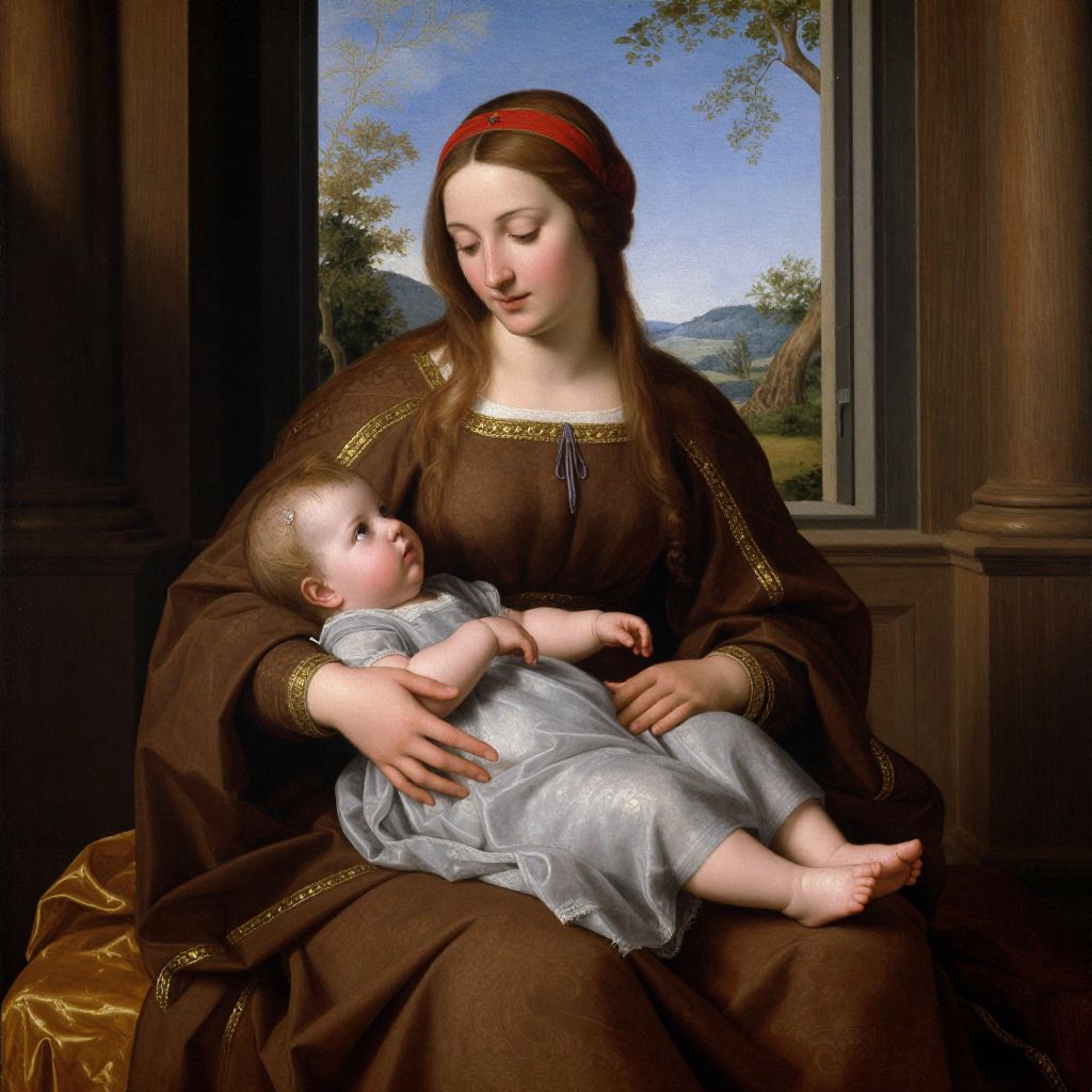 This is a detailed, digital reproduction of a Renaissance-style painting. It depicts a fair-skinned woman with long brown hair, wearing a red headband and a brown, long-sleeved dress with gold trim, gently holding a chubby, light-skinned baby dressed in a light gray, embroidered dress. The woman sits on an ornate wooden bench, with a classical column and a window revealing a bright blue sky and green trees in the background. The baby looks up at the woman, who gazes down with a serene expression. The textures of the fabric and the soft light create a warm, intimate atmosphere.