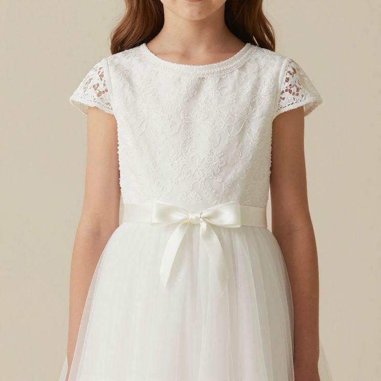 Photograph of a young girl in a white lace short-sleeve dress with a satin bow at the waist, standing against a plain beige background.