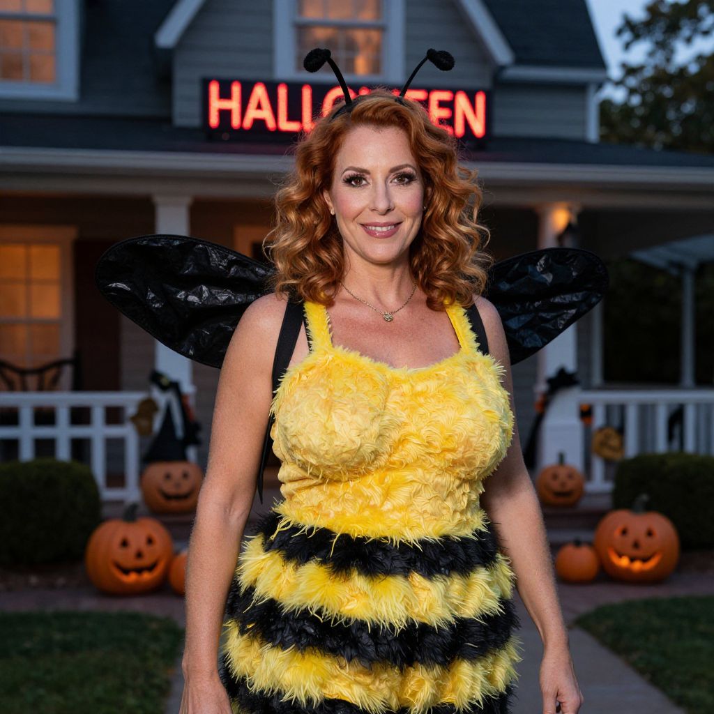 Photograph of a middle-aged Caucasian woman with curly red hair, wearing a yellow and black fuzzy bee costume with black wings and antennae headband. She has a fair complexion, is smiling, and has a slender, curvy figure. The costume has yellow fluffy sections and black stripe-like sections. She stands in front of a dark blue house with "HALLOWEEN" in red neon letters above the porch. Carved pumpkins with spooky faces are lined up on the porch steps. The background is dimly lit, suggesting evening. The overall scene is festive and Halloween-themed.