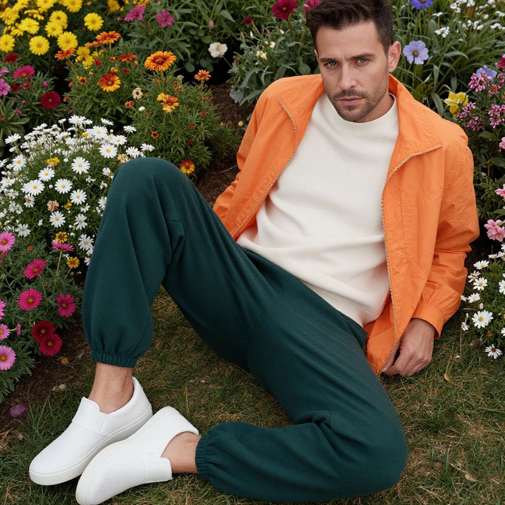A man, dark green lounge pants, cream crew neck sweatshirt, bright orange windbreaker, white sporty slip-on sneakers, vibrant flower beds, overhead shot, relaxed expression, surrounded by colorful blooms. Man has masculine face and piercing eyes