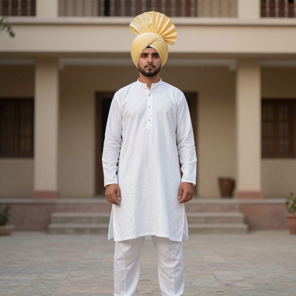 Photograph of a bearded South Asian man standing in front of a beige building with brown window bars. He wears a white traditional long kurta and matching white pants, paired with a large, yellow turban that is intricately tied. His dark eyes and short beard are visible. The background includes a stone-paved courtyard and steps leading to the building's entrance. The lighting is natural, highlighting the texture of his clothing and the building's smooth walls. The image has a slight vignette effect, drawing focus to the man.