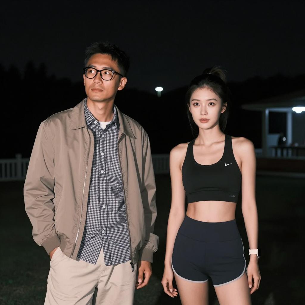 Nighttime photograph of two people standing outdoors. Man with glasses, light brown jacket, checkered shirt, and beige pants on left. Woman with tied-back hair, black sports bra, and dark shorts on right. Man looks left, woman looks forward. Dark background with faint lights and structures.