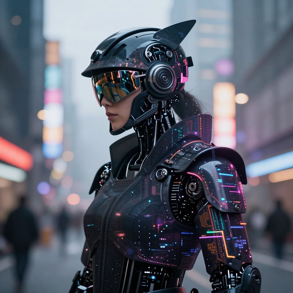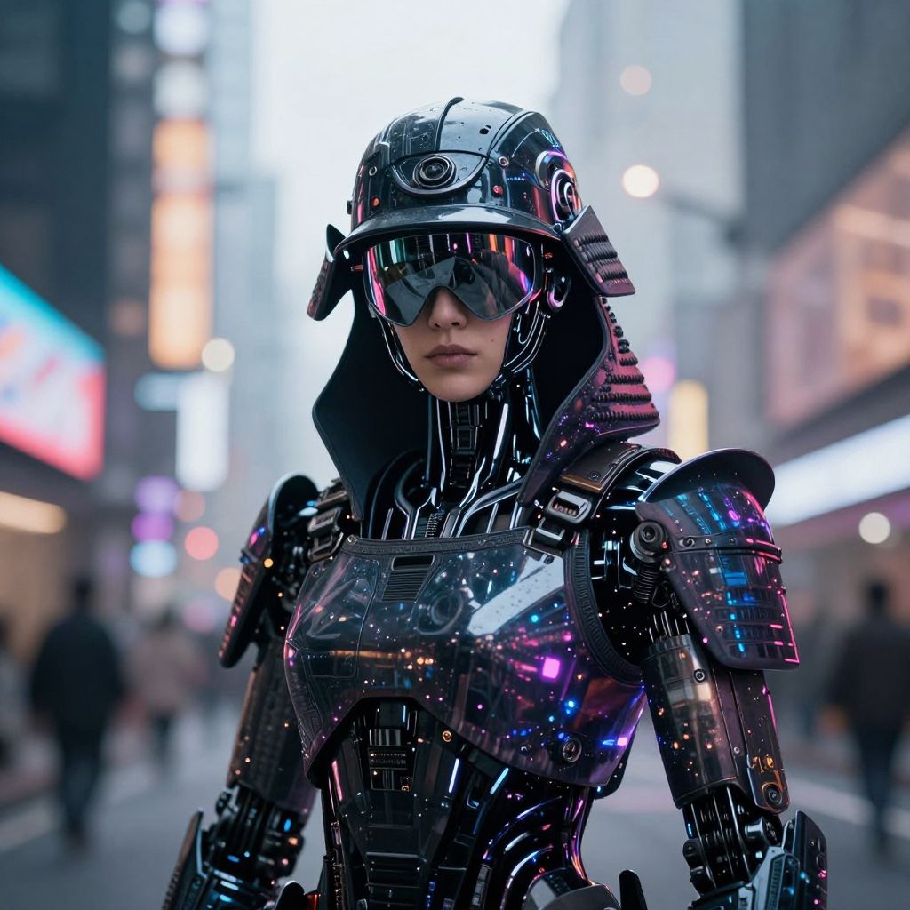 Cyberpunk woman in reflective, black robotic armor with glowing blue and purple lights, wearing a helmet with visor, standing in a brightly lit,