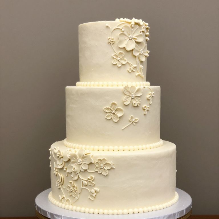 A beautifully crafted tiered wedding cake adorned with intricate filigree flower designs in buttercream, trending on Dribbble.