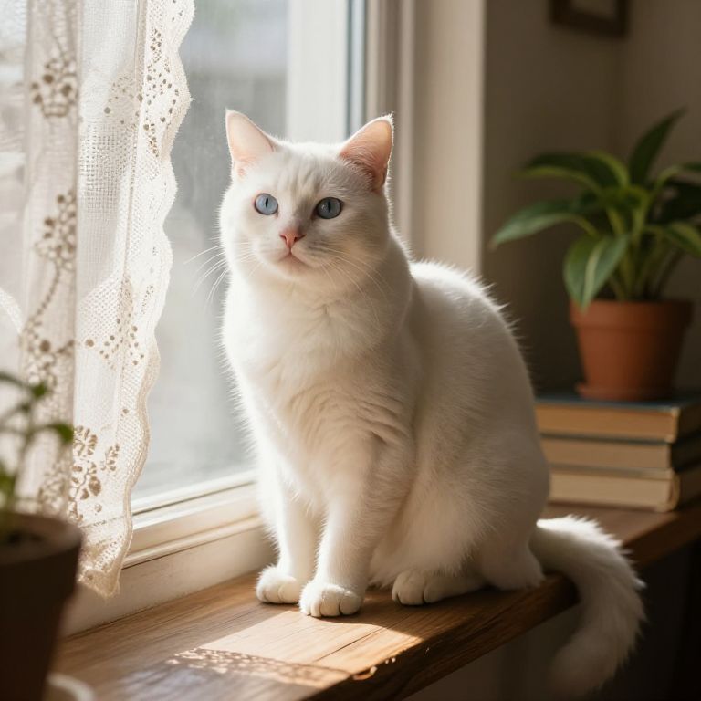 White cat sitting gracefully on a vintage wooden windowsill, soft sunlight filtering through lace curtains, delicate shadows highlighting its fluffy fur, cozy warm interior background with potted plants and old books, high detail, natural light