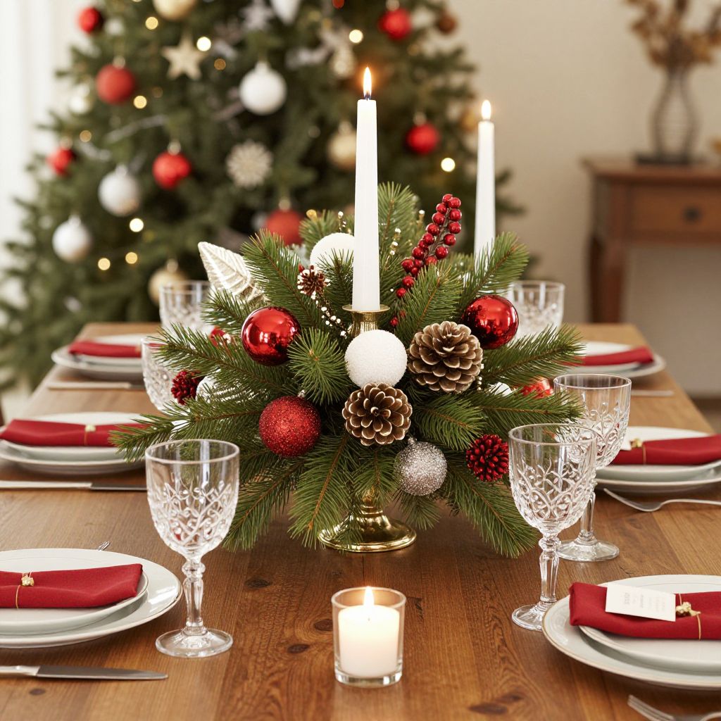 Photograph of a festive Christmas dining table. A wooden table is adorned with a red runner, a centerpiece of evergreen branches, red and white ornaments, red berries, and three tall white candles. Four places are set with white plates, silverware, and clear crystal wine glasses. In the background, a decorated Christmas tree with glowing lights and red ornaments is visible. The scene is brightly lit, emphasizing the holiday theme.