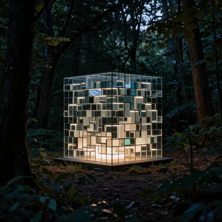 The image depicts a minimal geometric perlin noise sculpture with soft edges, crafted from glass and steel plates and illuminated with LED lights. The sculpture, which appears to be a cube with intricate patterns, stands out against the dark, forested background. The soft lighting from the sculpture casts a warm glow on the surrounding area, creating a stark contrast with the cool, dark forest. The sculpture is positioned centrally in the frame, with trees and foliage framing it from both sides, adding depth and context to the scene. The interplay of light and shadow enhances the three-dimensional quality of the sculpture, making it the focal point of the composition. The overall arrangement of elements creates a sense of harmony and balance, with the sculpture serving as a beacon of light in the otherwise dimly lit forest.