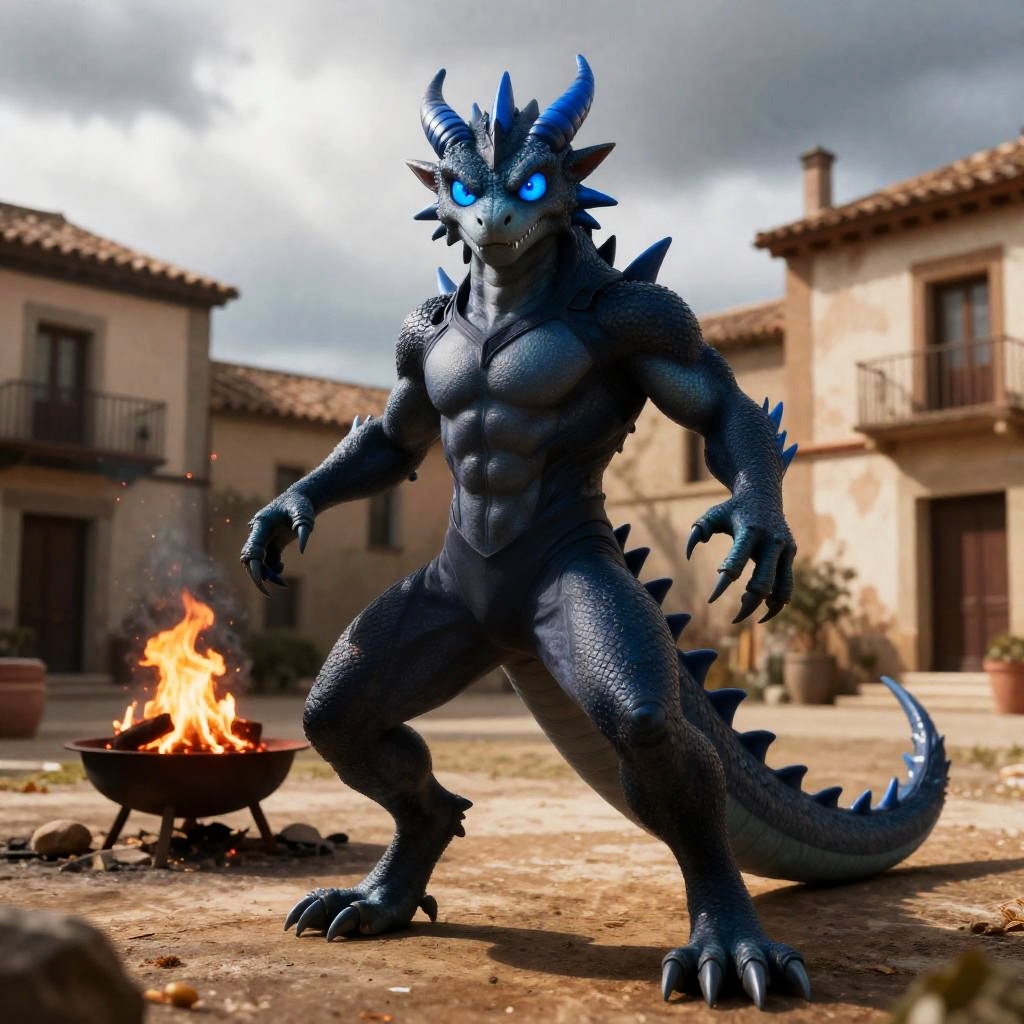 Solo, male, (athletic:0.7), (slim:0.8), (lean), secret agent, dragon, (defensive action pose):1.3, (kemono:0.2), stealth suit, ((clothed)), detailed eyes, large tail, horns, ((bust portrait)), (detailed eyes, blue eyes, glowing eyes):1.1, (outdoors:1.35), altar, village, Spain, old decrepit buildings, autumn, firepit, overcast, (grey sky), day time, sun rays, (particles, firefly, red glowing):1.3, detailed background, photorealistic, realistic hands, 8k hd, (dark shadows, wide dynamic range, hdr), by (by Pino Daeni, (by ruaidri), by virtyalfobo), (best quality, masterpiece:1), furry scalie male anthro vergence, lizard, smooth body, blue teeth, wide-eyed, (dynamic angle), blue nose horn, blue ribbed eyebrows, detailed blue eyes, blue chin spikes, chin frills, spines, blue spikes going down back of neck, (detailed pupils)