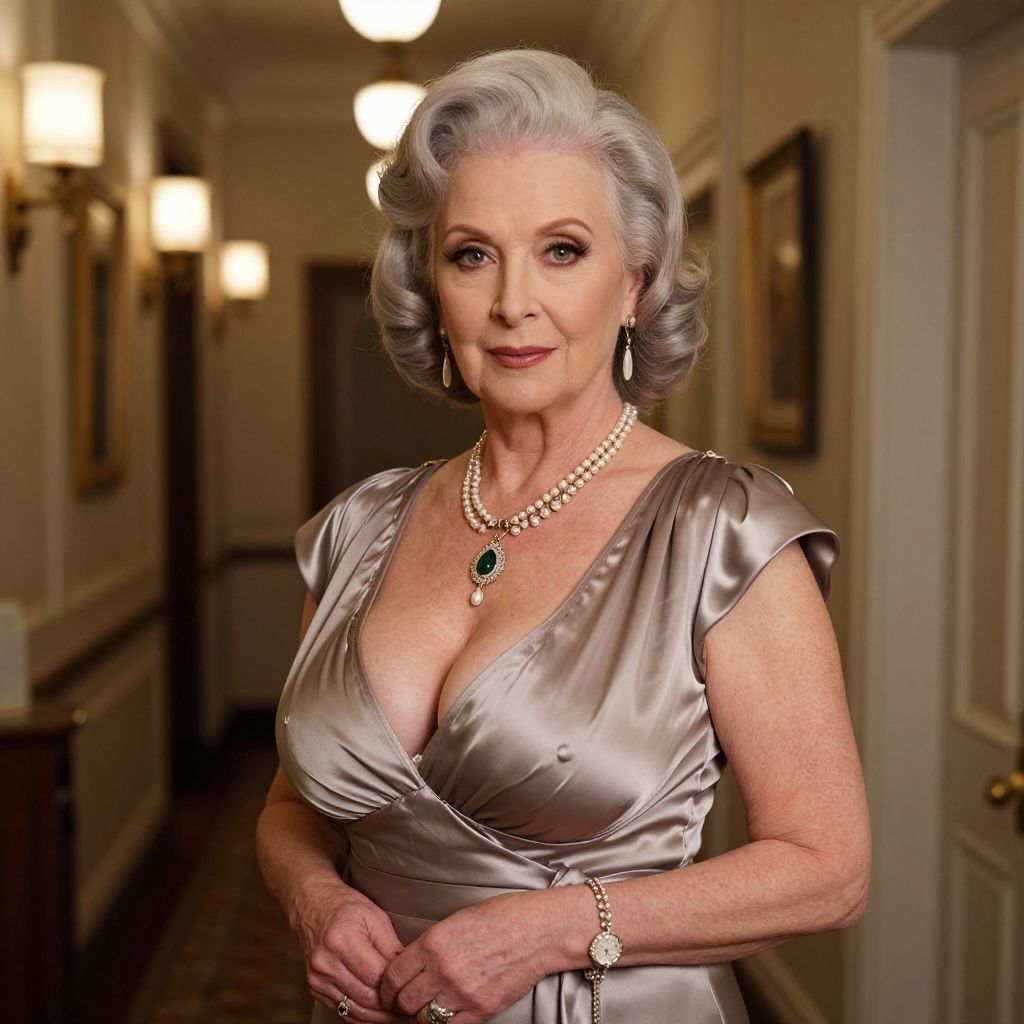 An older woman with softly greying silver hair styled in a vintage wave, dressed in a glamorous 1940s-inspired costume with satin fabric and elegant jewelry, standing in a beautifully lit vintage-themed hallway, posing with a dignified look and confident gaze. The woman has big tits and cute face