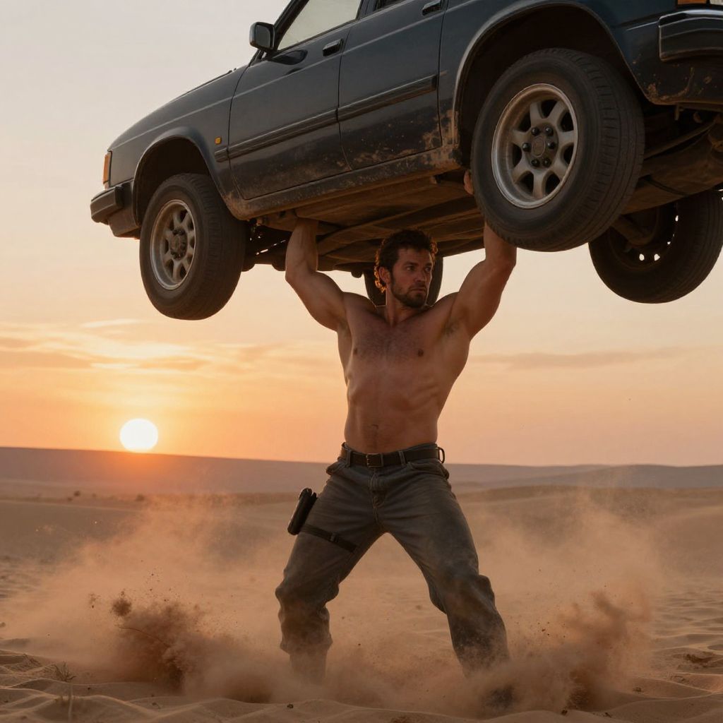 Man lifting car in a desert, dust clouds flying, sunset hues, intense muscle definition, epic heroic scene, digital painting