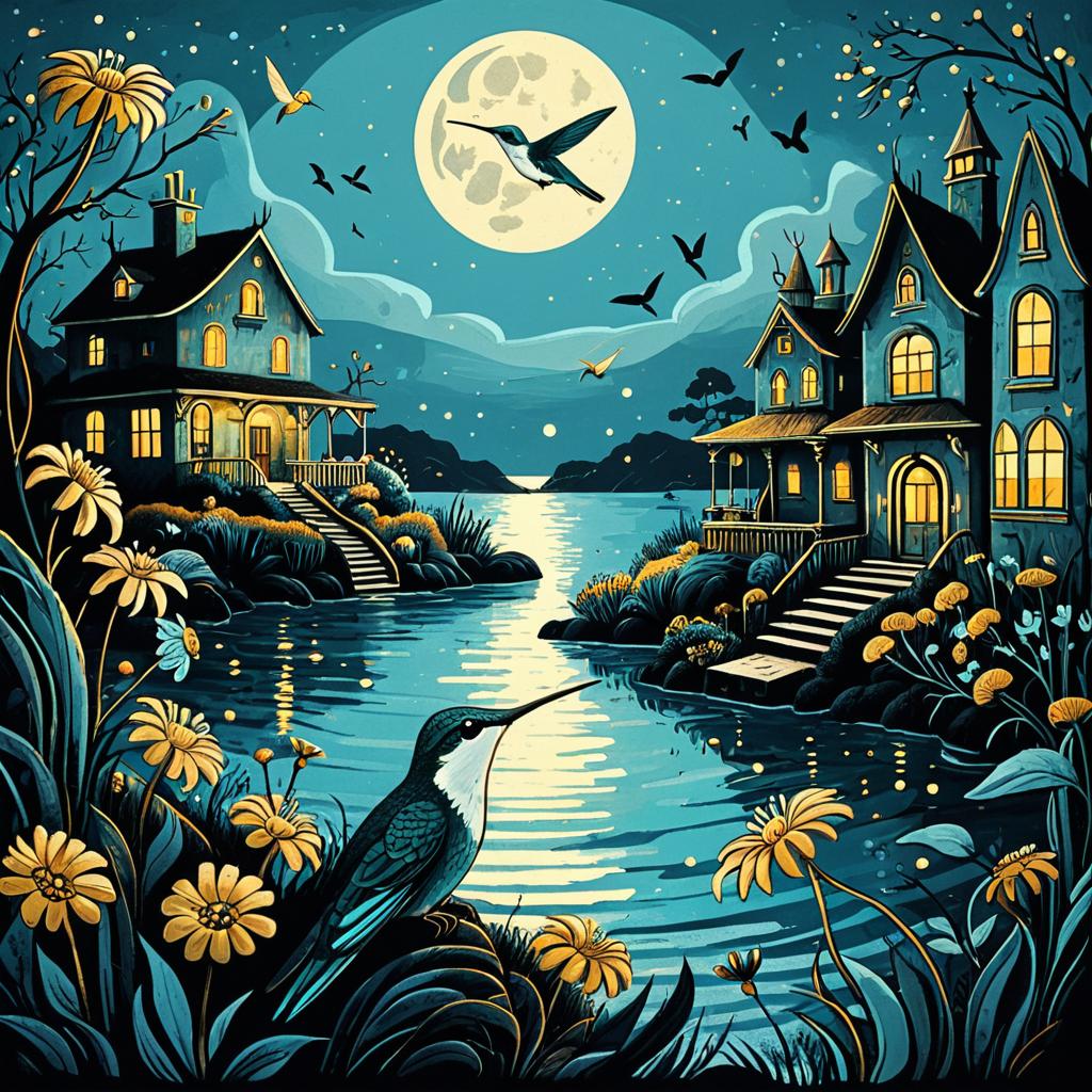 Hard cartoon illustration of owl by desert canyon, in the style of neon cyberpunk, with dark gold and light blue palette, dreamy quality, haunting houses, whimsical childlike figures, romantic moonlit seascape.