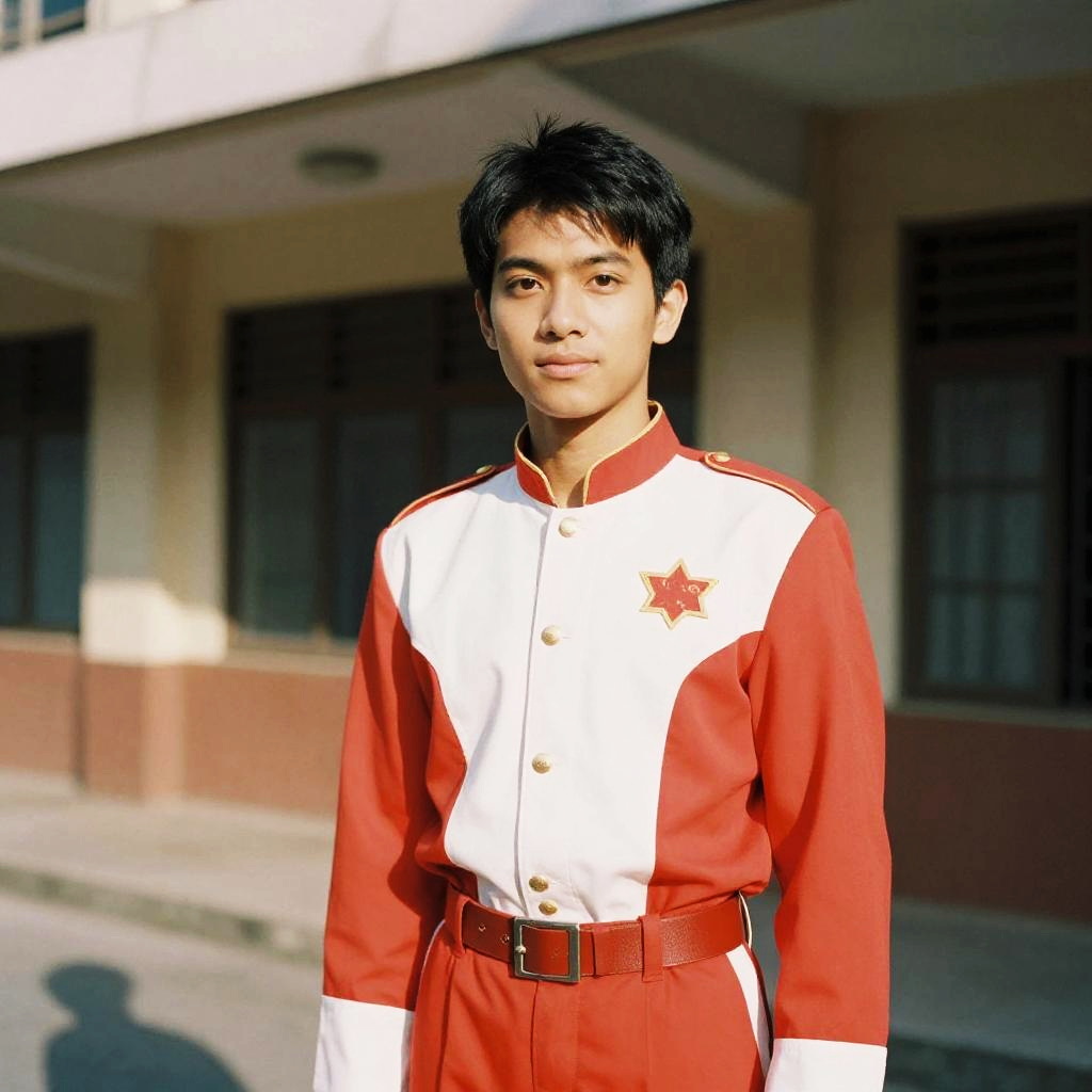 Pinoy Heroes Costume, man in a red and white uniform standing in front of a building --sref 1388