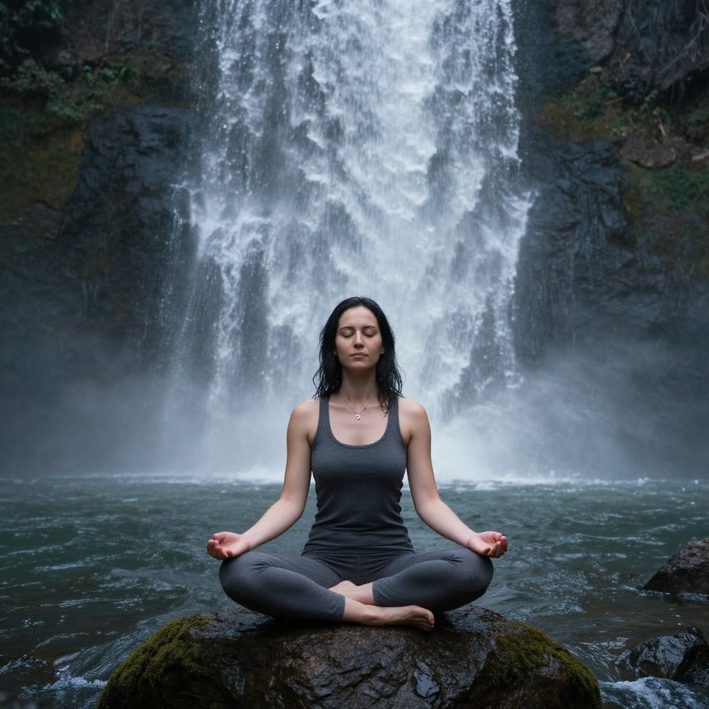 Serenity envelops the soul as a woman sits in quiet meditation before a cascading waterfall, her breath mirroring the rhythm of the rushing water, while the mist whispers tales of renewal and the timeless embrace of nature.
