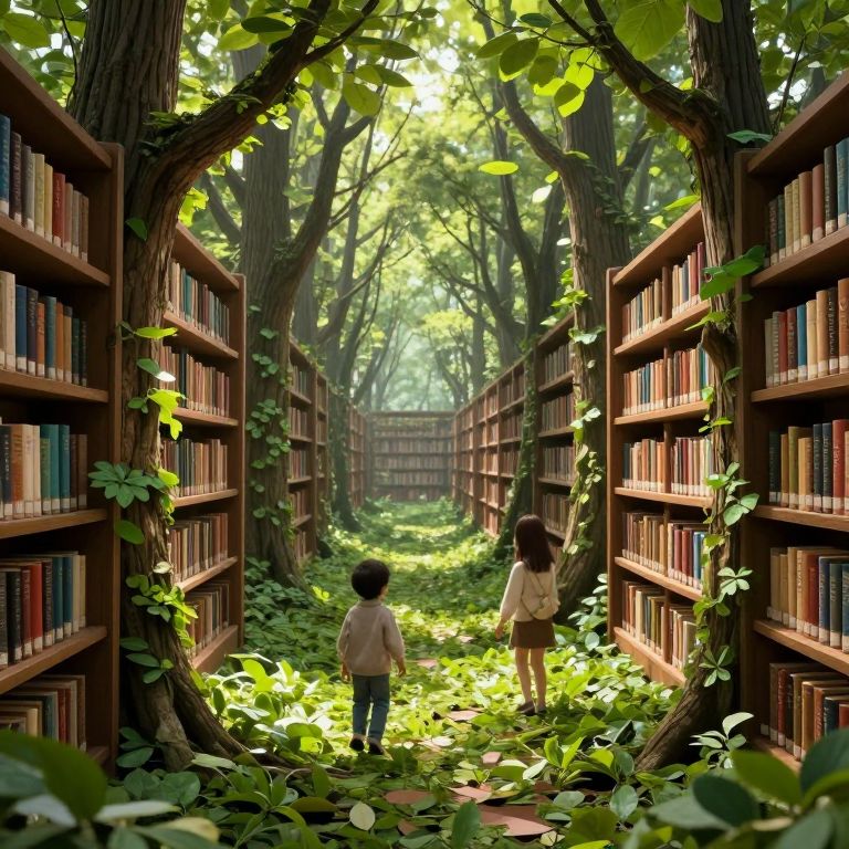 A library where books grow on trees and leaves whisper stories aloud when stepped upon by curious explorers defying logic.