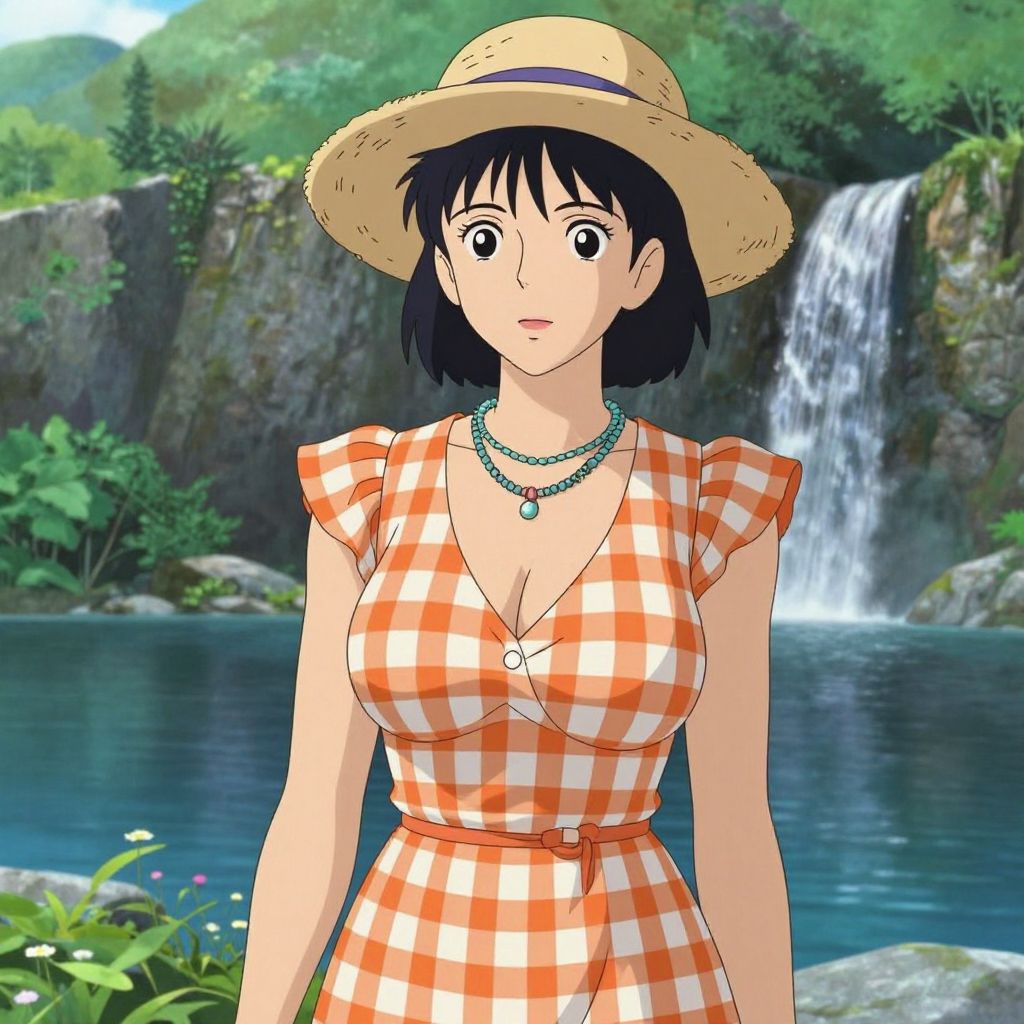 A woman, in a casual summer orange and white gingham dress with a V-neckline and short flutter sleeves, accessorized with a straw hat and layered necklaces, standing by a mountain lake with a waterfall, in the style of Kyoto Animation. Sexy. Pretty face and beutiful eyes Sexy. Pretty face and beаutiful eyes. Big breasts