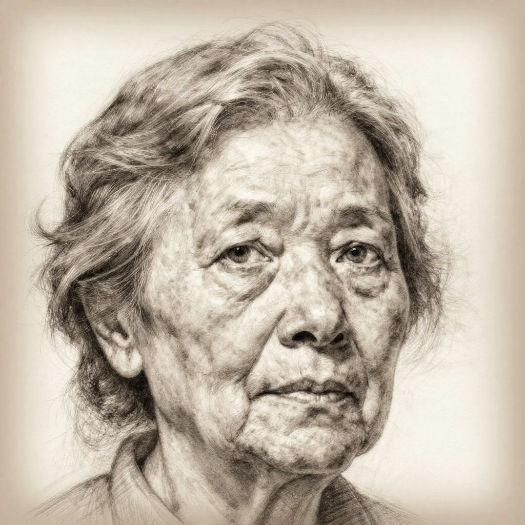 Artistic sketch of a close-up portrait of an elderly woman, delicate pencil work capturing wrinkles, expressive eyes, and textured hair, soft shadows enhancing the emotional depth and wisdom conveyed by her gaze, with a subtle vignette border.