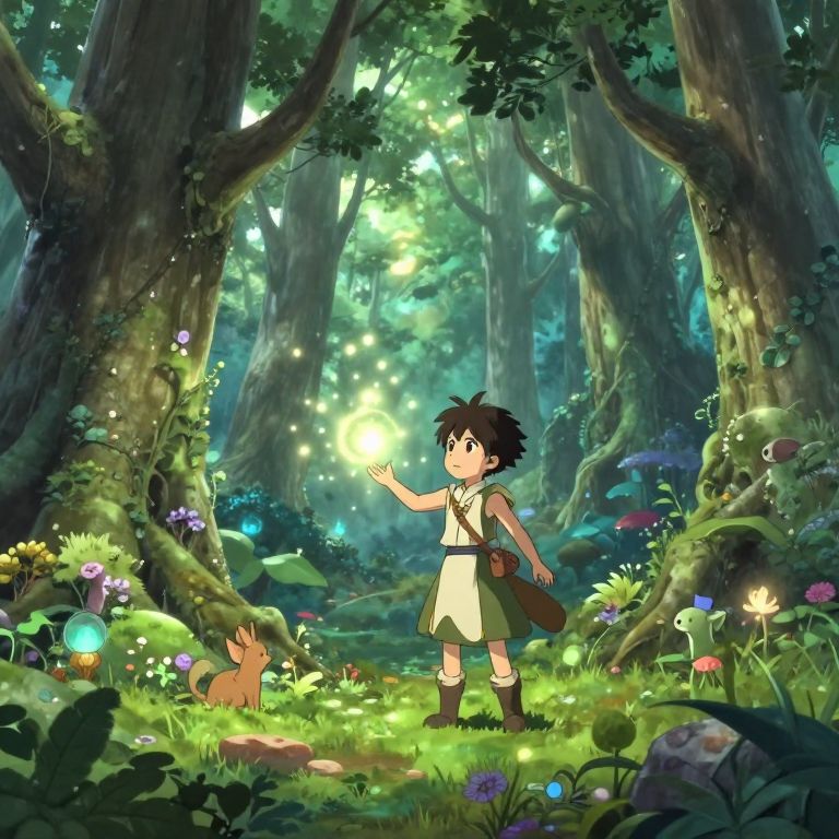 A vibrant, digital anime-style illustration depicts a young boy with spiky black hair, wearing a white sleeveless shirt, beige skirt, and brown boots, standing in a lush, sunlit forest. He holds a glowing, magical light in his right hand and carries a brown satchel on his left shoulder. Beside him, a small, brown, fox-like creature sits on a green path. The forest is dense with towering trees, colorful flowers, and glowing mushrooms, creating a whimsical, enchanted atmosphere. Sunlight filters through the canopy, casting dappled shadows on the forest floor.